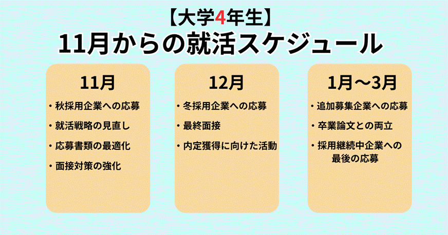 この記事では、11月からの就活事情や就活スケジュールなどを解説しました。