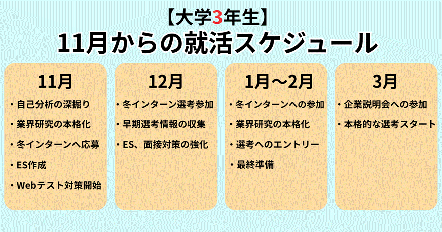 大学3年生の11月は、本格的な就活準備を進める重要な時期です。以下のようなスケジュールで進めましょう。