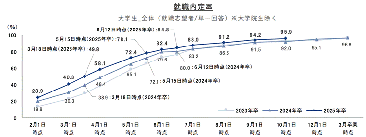 就職みらい研究所の調査によると、2025年卒の9月1日時点の就職内定率は94.2%でした。