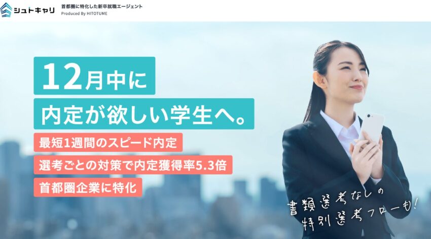 | シュトキャリ | 就活エージェント | 非公開 | 面談、書類添削 | スタートアップ志望向け | https://hitotume.co.jp/shutocari/lp/ |